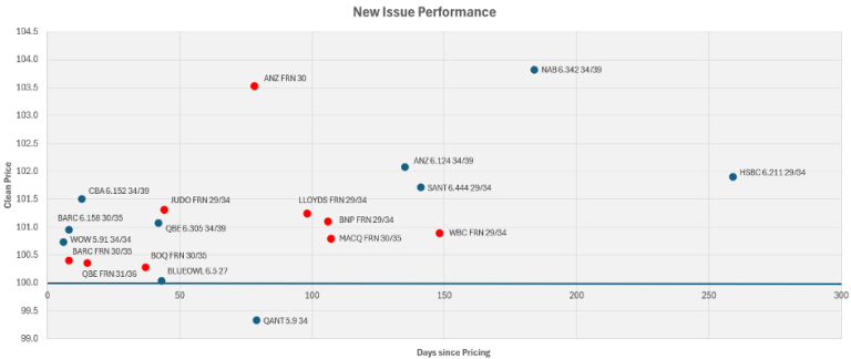 The blue dots reflect fixed rate bonds and the red dots show floating rate notes. The chart illustrates that both have moved higher with the strongest performance coming from ANZ floating rate note and an NAB fixed rate bond. Both are trading at a c.103.5, or higher, on top of strong income accruals. That is a great outcome for investors who participated in those issues only a few months ago.