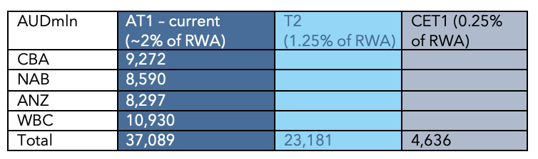 Based on current AT1 capital levels of the major banks, we estimate this equates to around AUD23bln of T2 (1.25% of T2) and AUD5bln of CET1 (0.25% of CET1 capital) issuance, respectively. Note this is based on the current risk-weighted asset (RWA) profile of a major bank, whereby a major bank has an average 2% of their RWA in AT1 and doesn’t account for growth in the asset book. Furthermore, there is an estimated AUD2bln shortfall of T2 across the major banks based on current Total Loss Absorbing Capital (TLAC) requirements which will need to be met.