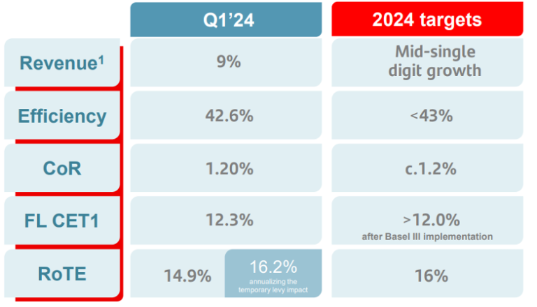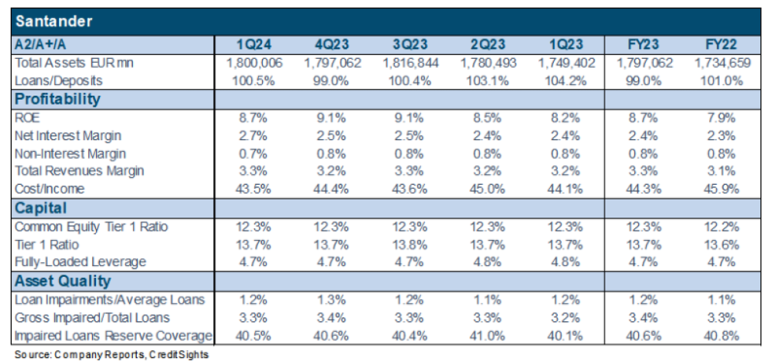 Q1 2024 results for the group were strong and Santander is on track to deliver 2024 targets. Santander’s focus on profitability and efficiency, as opposed to growth, is credit positive.